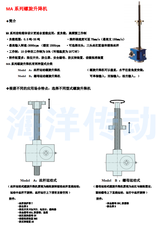 的設計,緊湊的鋁齒輪箱體,與 MA系列有低的價格額定負載: 0.5噸 - 20噸 推桿升降速度可至30mm/s 高輸入轉速:1500rpm 工作制:20%(10分鐘運行2分鐘)可選擇雙頭,三頭絲杠配套,參數咨詢我公司附件:齒隙抵消裝置,防轉轉置,安全螺母,防塵罩,磁感應限位開關 MA系列普通齒螺旋升降機 更適合重載應用:重負荷,高頻繁工作制 額定負載: 0.5噸 -35噸 推桿升降速度可至75mm/s 高輸入轉速: 3000rpm 工作制:30%(10分鐘運行3分鐘)