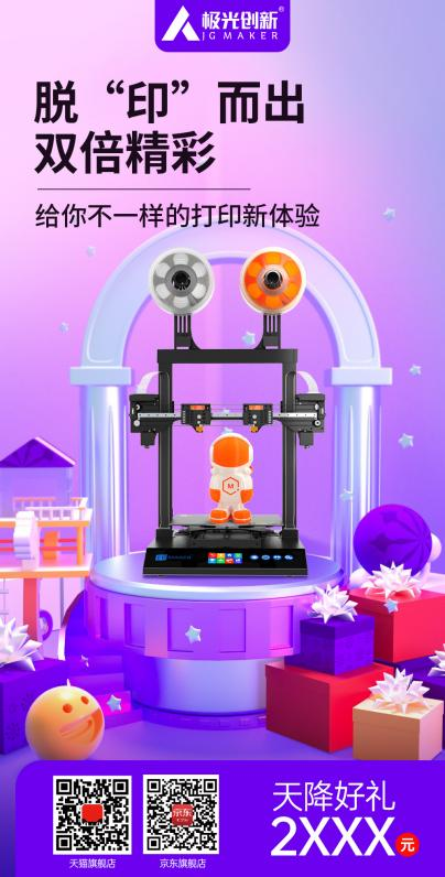 當然,除了以上提到的機型,你還可以在極光創新天貓或京東旗艦店選購其它類型的3D打印機相關產品。時值雙十一購物節到來之際,極光創新旗下多款爆款產品折扣力度驚人,購買同時還有多種好禮相送,對于近期有購機計劃的朋友千萬不要錯過此次的雙十一購物狂歡節。