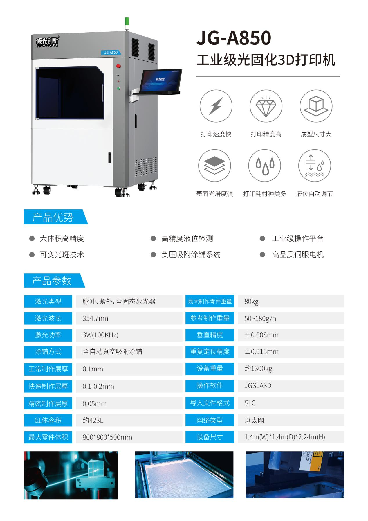 深圳市極光創新科技股份有限公司自2009年成立至今,一直保持初心,專注于3D打印技術的開發及綜合應用。隨著增材制造技術的迅速發展,極光創新工業級產品也深入到各行業中,其中工業級SLA光固化3D打印機更是憑借其高精度、高速度、低成本的特點,和600*600*410和800*800*500兩種超大打印空間,更大限度的提高了工業生產的生產率和靈活性,全方位滿足工業級大尺寸用戶的需求,受到了市場用戶的極度青睞。