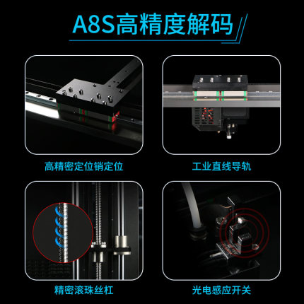 對(duì)于打印精度以及打印效果穩(wěn)定、機(jī)器運(yùn)行穩(wěn)定的雙穩(wěn)定上,A8S投入了十足的零件用料和技術(shù)投入。運(yùn)動(dòng)組件、擠出組件、控制組件,在三大功能組件上都遵循了嚴(yán)格的質(zhì)量控制。