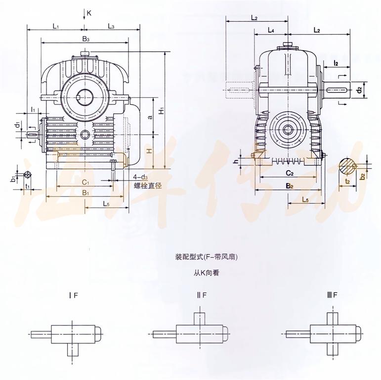 蝸桿轉速不超過1500r/min,蝸桿軸可正、反向運轉,工作環境溫度為-40℃~+40℃,當工作環境溫度低于0℃,啟動前潤滑油必須加熱到0℃以上,當工作環境溫度高于40℃必須采取冷卻措施。