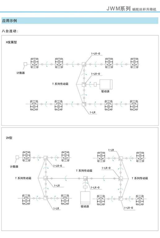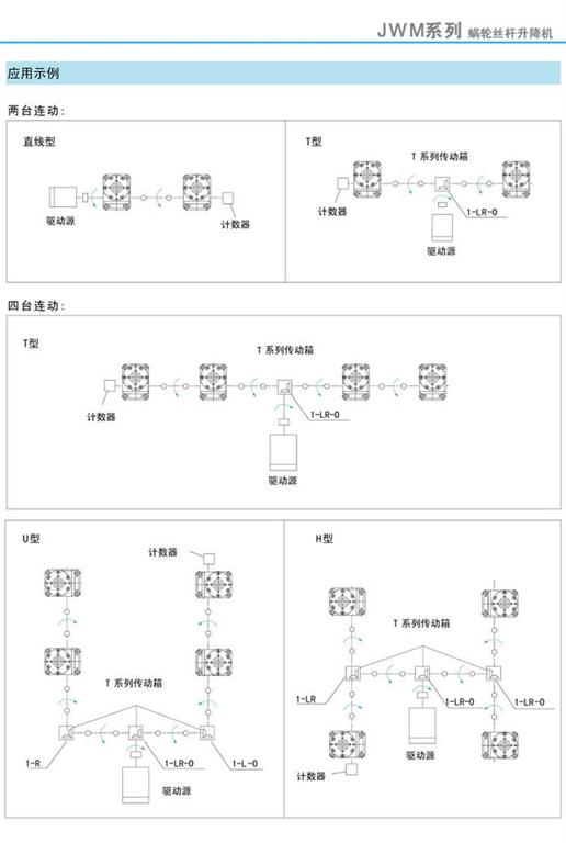 JWM蝸輪絲桿升降機(jī)應(yīng)用示例(兩臺(tái)連動(dòng)/四臺(tái)連動(dòng)/八臺(tái)連動(dòng))