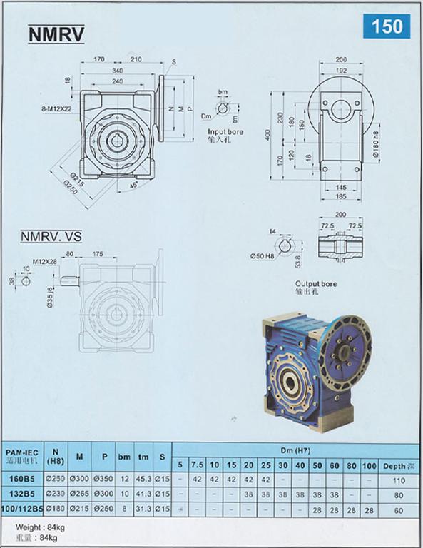 NMRV/RV150型蝸輪蝸桿減速機中心距150mm,同其他RV系列減速機相同,可軸輸入、法蘭輸入、法蘭輸出、軸輸出等多種方式。 RV150蝸輪蝸桿減速機速比有:5 7.5 10 15 20 25 30 40 0 60 70 80 100等。