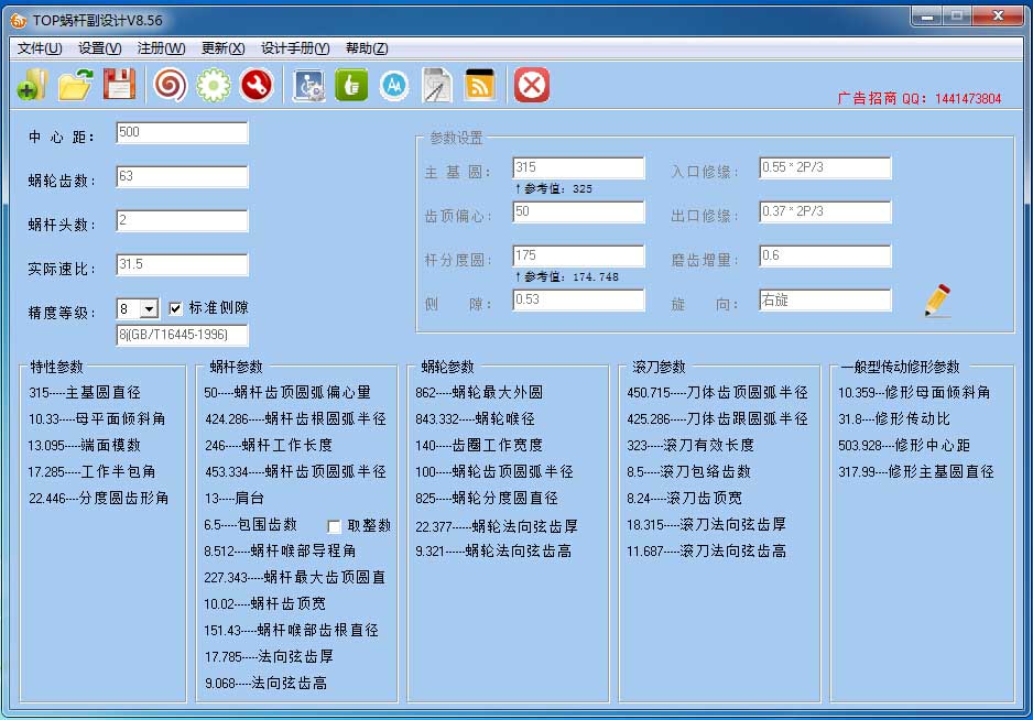 按常規方式計算二次包絡蝸桿副的各項參數相當復雜,而且計算各項參數時很容易計算或者填寫錯誤,一旦出錯加工時所造成的原材料及工時的損失巨大。本軟件計算式只需要中心距和速比,只要這兩個參數不出錯 其它計算都時以電腦計算完成,出錯率幾乎為零。而且計算出來的數據都以保留3位小數為準。